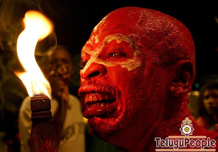 A red devil stares at fire during the National Carnival Commission's Traditional Mas competition at Victoria Square, Port of Spain, Trinidad and Tobago on February 10, 2010. (REUTERS/Andrea De Silva) #