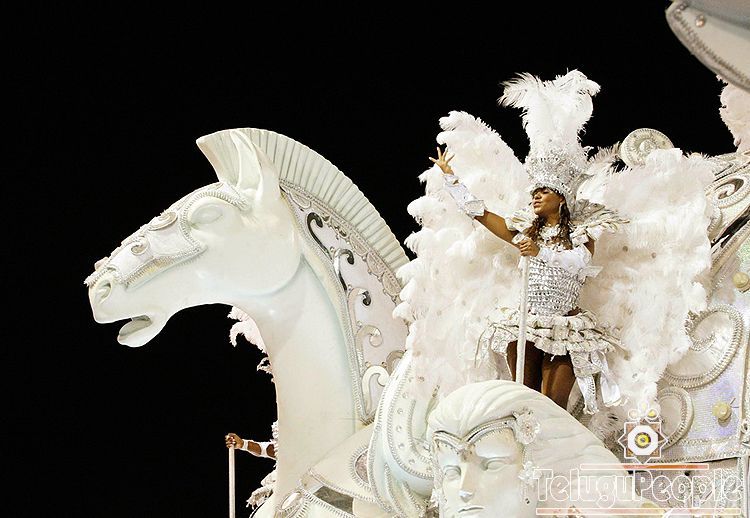 A reveller of the Imperatriz Leopoldinense samba school rides on a float in Rio de Janeiro's Sambadrome on February 14, 2010. (REUTERS/Sergio Moraes) #