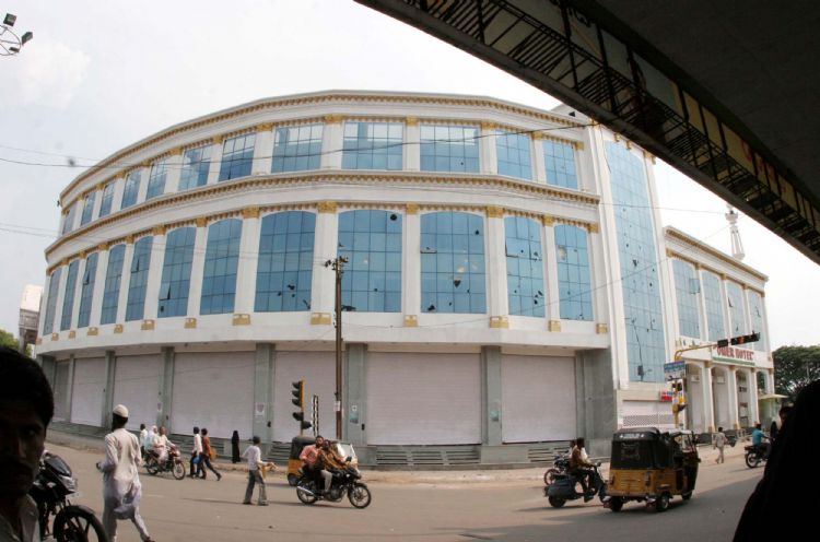 The glass panes covering the Omer Function Hall front elevation damaged by stones pelted by supporters of MIM MLA Akbaruddin Owaisi following an attack on his life by the building owner Mohammed Pahelwan at Chandrayngutta Crossroads in Hyderabad on Saturday. INN Photos