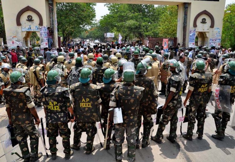 Police and para military forces deployed in and around OU campus in huge numbers to prevent students from other regions of Telangana join Osmania students in their indefinet hunger strike launched on Monday opposite University Arts college building. INN Photos
