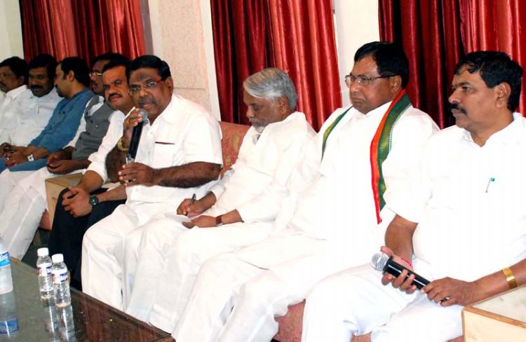 Congress leaders from Telangana meeting at Exhibition Grounds, Nampally in Hyderabad on Saturday. INN Photos