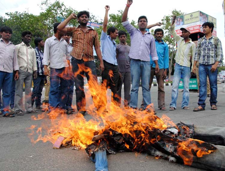 Nizam College students burn effigies depicting Ministers Danam Nagender and Mukesh Goud, demanding their immediate resignations on separate Telangana issue at Basheer Bagh in Hyderabad on Saturday. INN photos