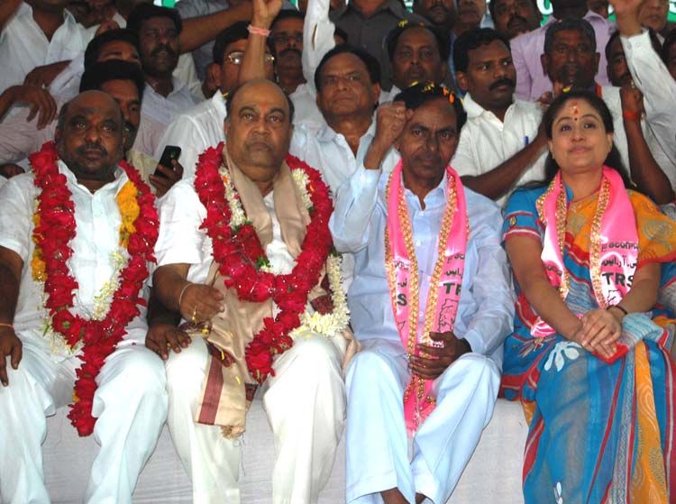 TRS chief KCR along with party secretary general Vijayasanthi visits the ‘Ekta Deekhsa’ camp of suspended TDP leader Nagam Janardhan Reddy at Indira Park in Hyderabad on Monday. Mr Nagam is on a 48-hour hunger fast to unite all separate statehood protagonists on one platform to further strengthen the separate Telangana statehood movement. INN Photos