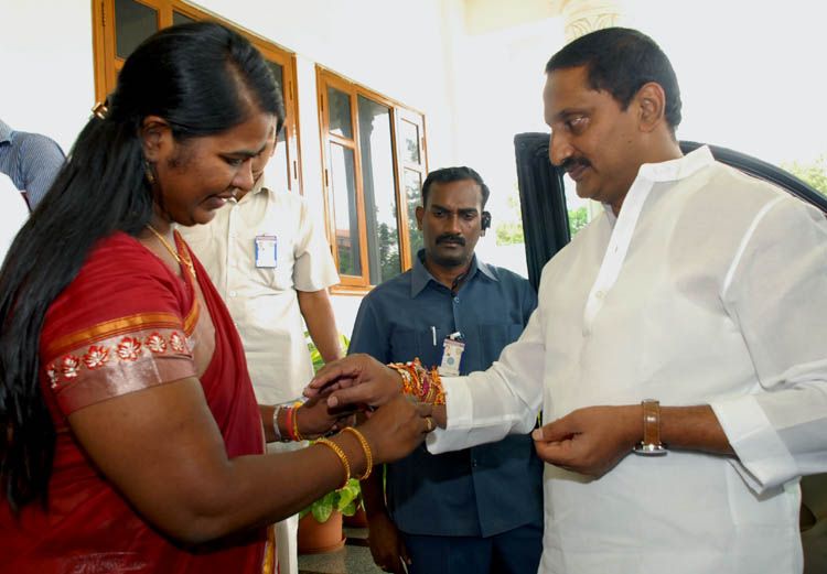 Mayor Banda Karthika Reddy tying a rakhi to Chief Minister N.Kiran Kumar Reddy at his camp office on Saturday on the eve of Raksha Bandhan.