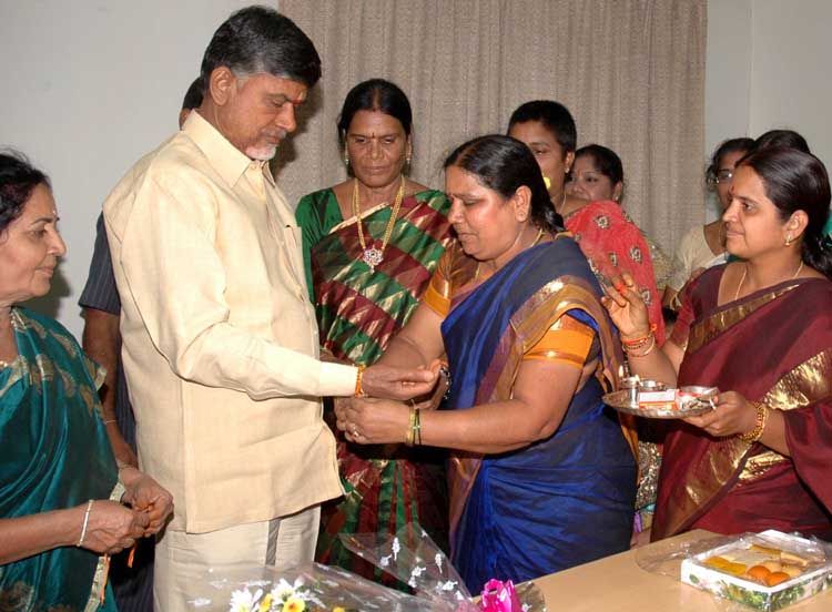 Woman party workers tying rakhi to TDP president N.Chandra Babu Naidu on the occasion of Raksha Bhandan on Saturday at NTR Trust Bhavan, Hyderabad- INN Photos