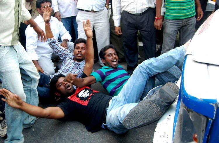 Telangana activists damaging the car of Vijayawada MP Lagdapati Rajagopal at Jubilee Hills police station. The police towed the car while the MP was still seated in it - INN Photos