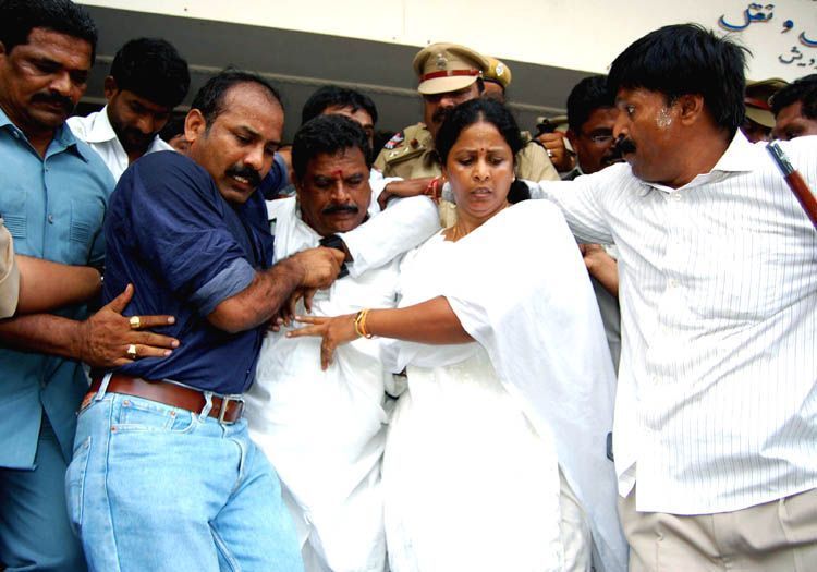 Police forcifully taking TE-JAC chairman Swamy Goud into custody while T activists trying to prevent the act at RTA office at Khairtabad here on Tuesday - INN Photos