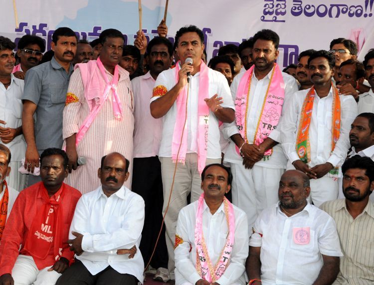 TRS Sircilla MLA K.Taraka Rama Rao addressing the gathering who participated in rasta roko in Bhoraj village, Adilabad district on Monday. TRS Assembly floor leader Etela Rajender, Adilabad MLA Jogu Ramanna are seen in the picture.