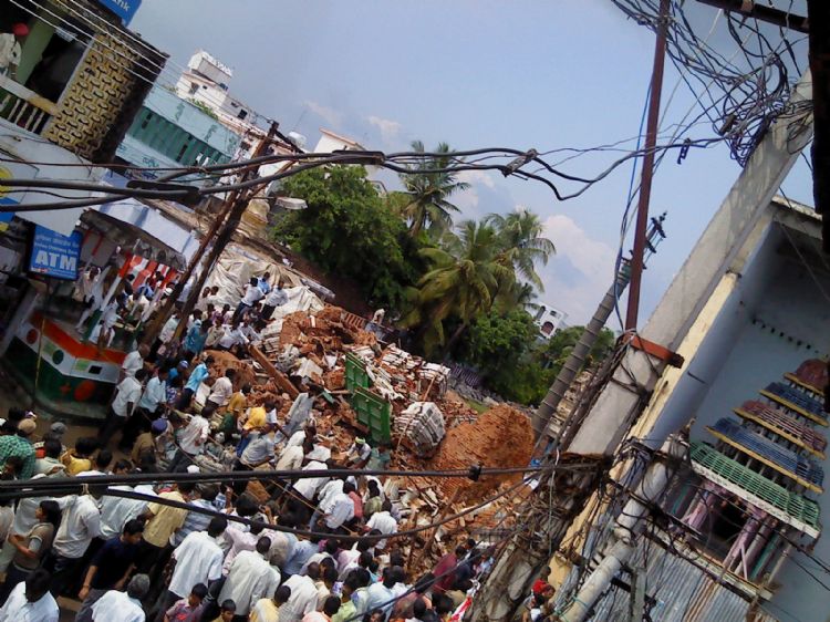 Gali Gopuram of Bhavanarayana Swamy temple in Bapatla in Guntur district collapsed on Sunday around noon. Former Endowment Minister Gade Venkata Reddy on Sunday held Archaeology Department responsible for the collapse. Photos by Sthanam Bharadwaj.