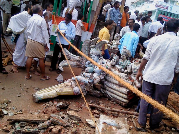 Gali Gopuram of Bhavanarayana Swamy temple in Bapatla in Guntur district collapsed on Sunday around noon. Former Endowment Minister Gade Venkata Reddy on Sunday held Archaeology Department responsible for the collapse. Photos by Sthanam Bharadwaj.