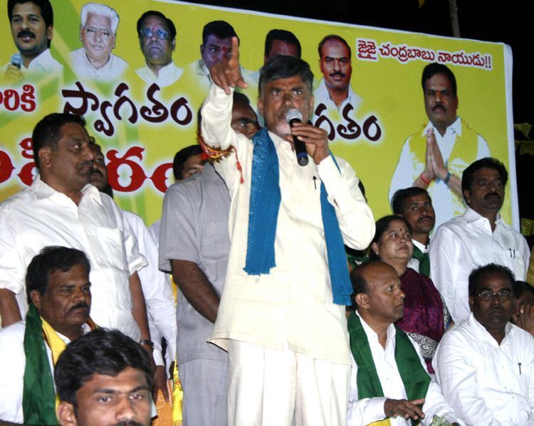 Telugu Desam president N.Chandrababu Naidu addressing the gathering at Amanagallu in Mehaboobnagar district as part of his Rythu Porubata on Saturday.