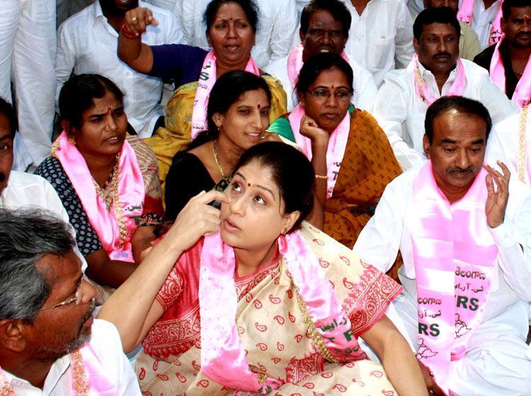 TRS MP Vijayashanti and other leaders staging a dharna at the Agriculture Commisionarate opposite Nizam College here on Saturday demanding government to declare Telangana as 'drought-hit' - INN Photos