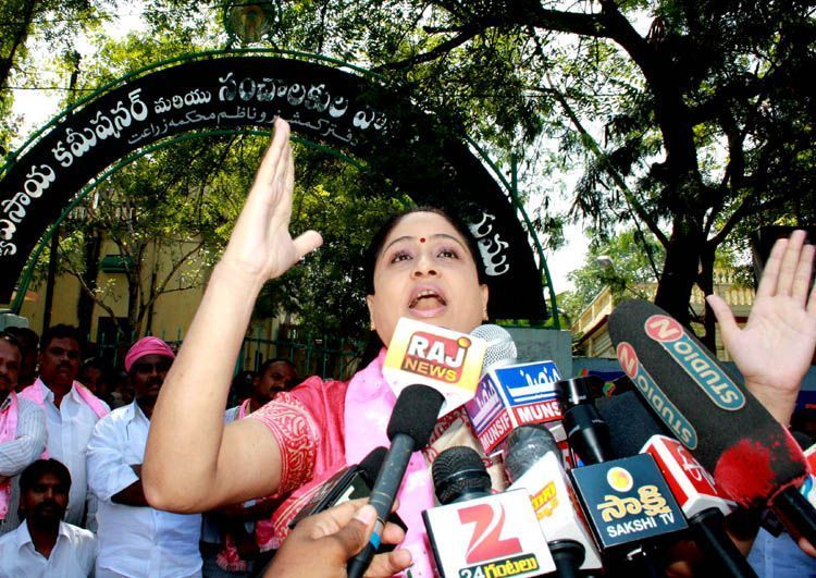 TRS MP Vijayashanti and other leaders staging a dharna at the Agriculture Commisionarate opposite Nizam College here on Saturday demanding government to declare Telangana as 'drought-hit' - INN Photos