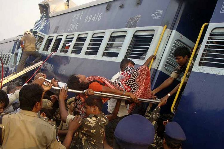 Rescue Operation: A view of the accident site near Penukonda railway station in Anantapur district where the Bangalore-bound Hampi Express rammed into a staionary goods train.