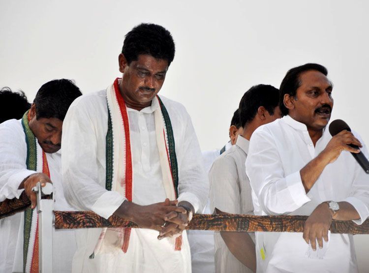 Chief Minister N.Kiran Kumar Reddy addressing voters during his election campaign in Narasannapeta on Friday while the Congress nominee Dharmana Ram Das looks exhausted.