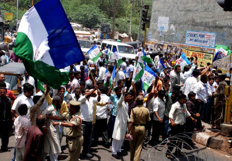 YSR Congress activists celebrate their party's victory on the streets of State capital here on Friday. Police prevented the activists from visiting the Chanchalguda Central Jail by erecting barricades - INN Photos