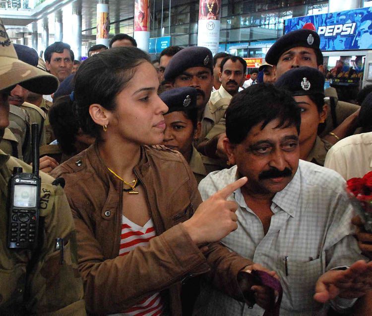 Saina Nehwal gets rousing welcome as she returns home with her Olympic bronze medal at Shamshabad Airport here on Tuesday - INN Photos