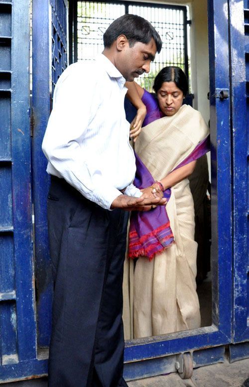 Suspended senior IAS officer Y Srilakshmi being helped out by her IPS husband Gopi Krishna while coming out of Women's Prison at Chachalguda here on Tuesday - INN Photos