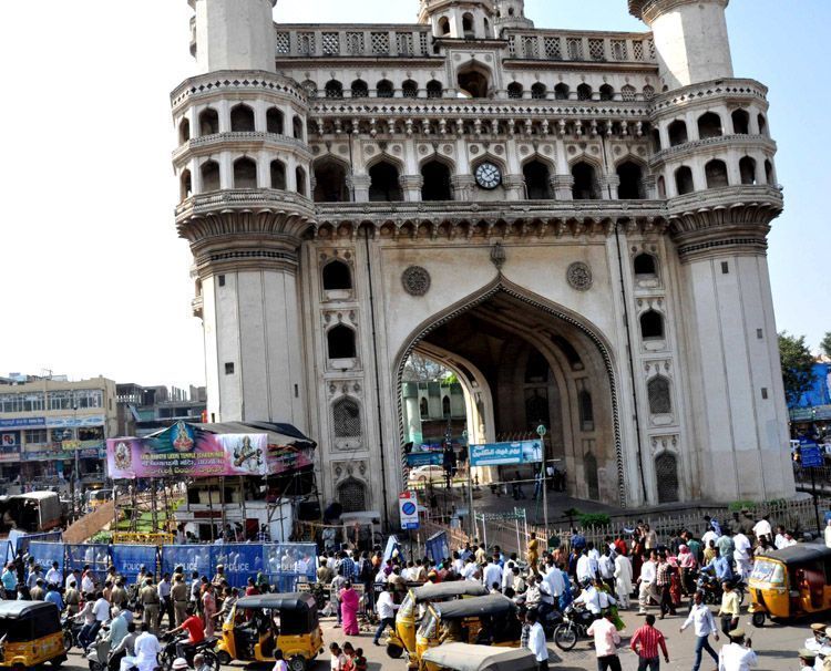 Devotees form long queues to offer pooja at Bhagyalakshmi temple abutting Charminar while the City Police allowed general traffic around the monument after three days on Wednesday - INN Photos
