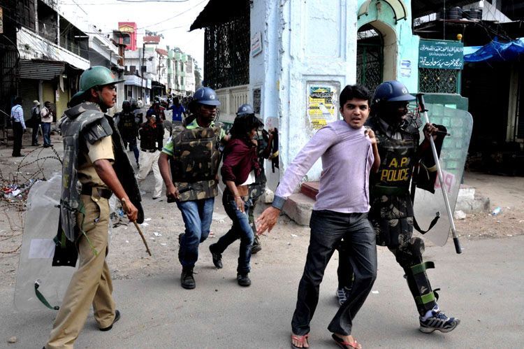 Police forces take control of Old City roads and lanes following tension over alleged expansion of Bhagyanagar Temple abutting Charminar here on Sunday - INN Photos