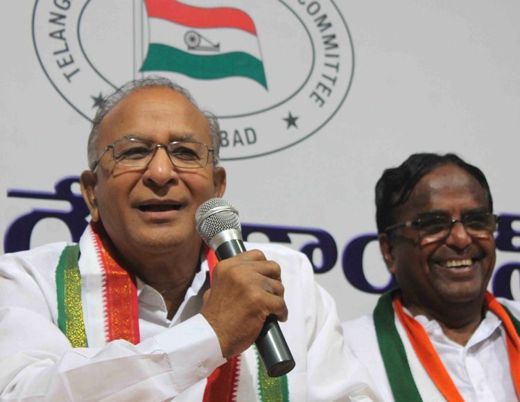 Former union minister S Jaipal Reddy, TPCC president Ponnala Lakshmaiah addreses media persons at Gandhi Bhavan on Friday.