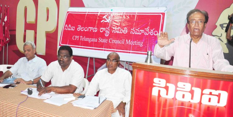 CPi National General Secretary Surawaram Sudhakar Reddy speaking at CPI Telangana State Council meetings at makhdoom bhavan in Hyderabad on wednesday
