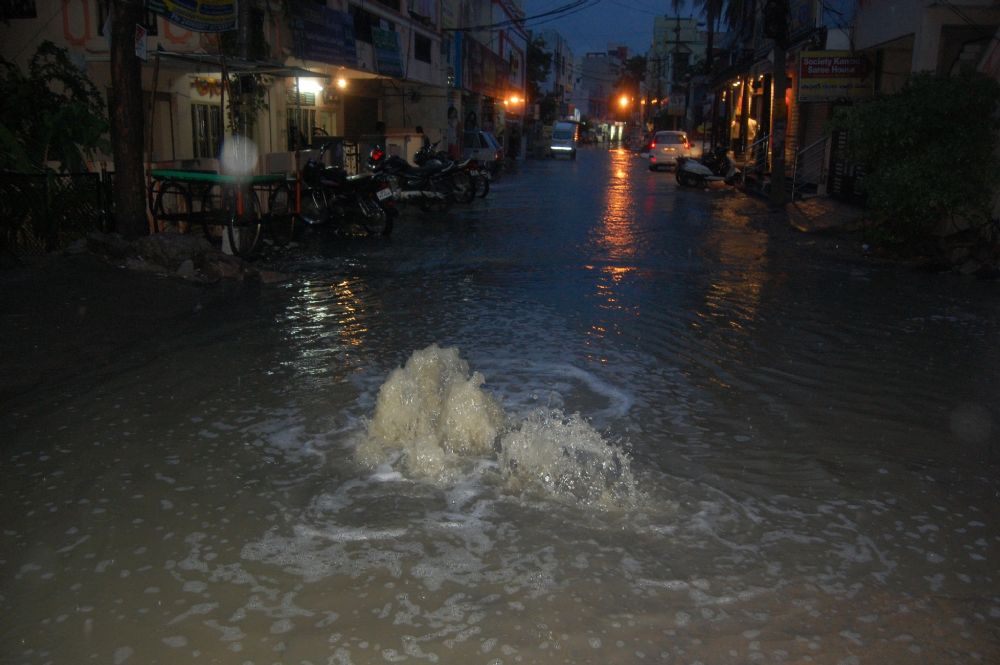 Pedestrians walk through the flooded streets after heavy rain lashed Hyderabad on June 12, 2015.