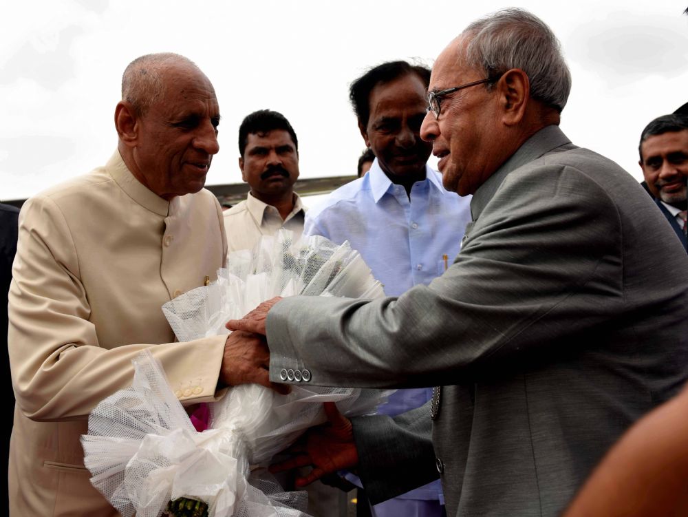 Chief Minister K.Chandrashekhar Rao, Governor ESL.Narasimhan bidding farewell to the President of India Pranab Mukherjee at Hakimpet Airport Hyderabad on 8th July 2015.