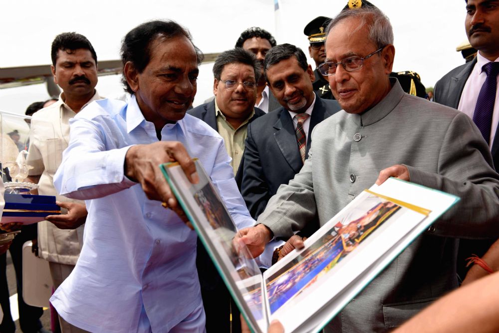 Chief Minister K.Chandrashekhar Rao, Governor ESL.Narasimhan bidding farewell to the President of India Pranab Mukherjee at Hakimpet Airport Hyderabad on 8th July 2015.