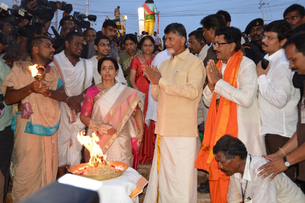 Nitya Harathi performing by Chandrababu Naidu at Godavari Pushkar Ghat on the last day of the 12 day Maha Pushkaram in Rajahmundry on Saturday.