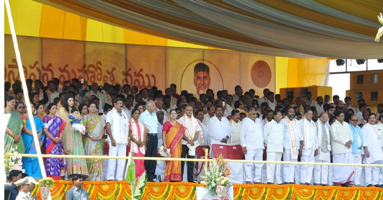 Narendra Modi Prime Minister of India seen Laying foundation stone for the New Capital City (Amaravati) of Andhra Pradesh at Uddandurayanupalem, Guntur District. Sri E.S.L. Narasimhan Governor, N.Chandrababu Naidu Chief Minister of AP & K.Chandrasekhar Rao Chief Minister of Telangana and other Dignitaries are also seen