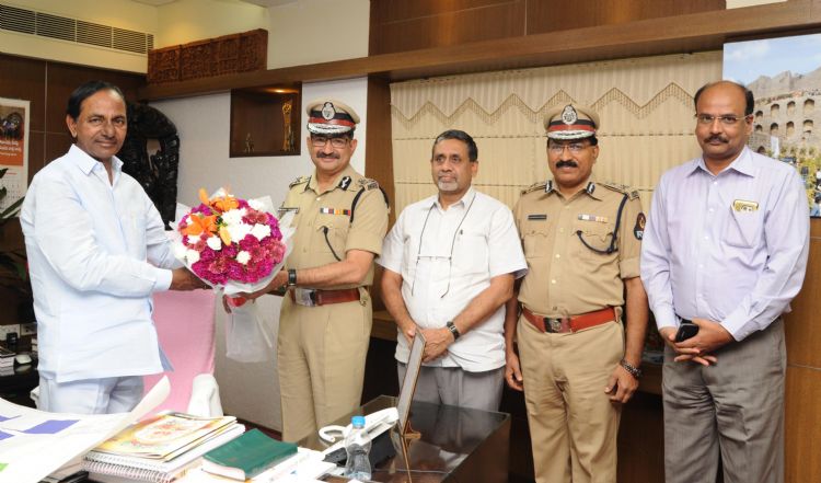 Telangana Chief Minister K. Chandrasekhar Rao congratulating newly appointed DGP Anurag Sharma at Camp Office in Hyderabad on 13th November 2015.