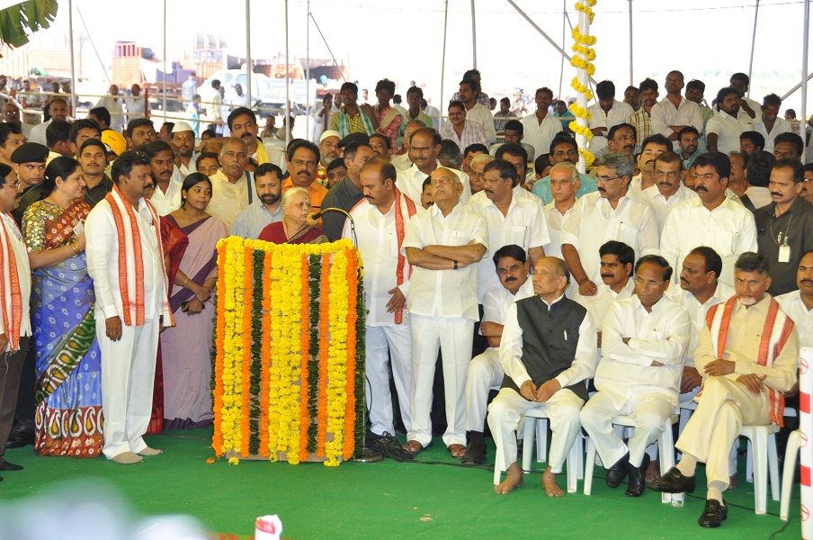 Andhra Pradesh Chief Minister N.Chandra Babu Naidu laying foundation stone for Temporary Secretariat Building at Velagapudi on 17th February 2016.