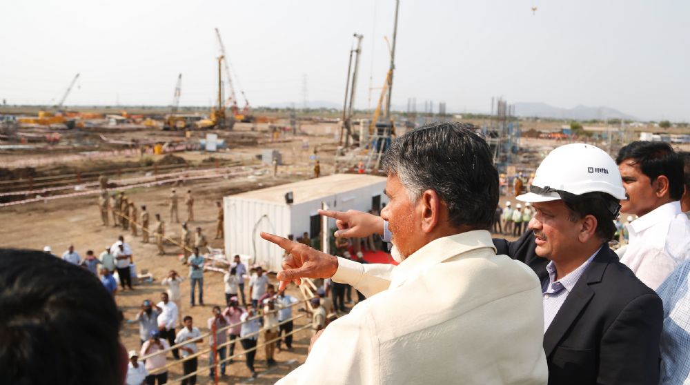 Andhra Pradesh Chief Minister N. Chandrababu Naidu inspects the ongoing temporary Secretariat work at Velagapudi village in Guntur District on 25th March 2016.