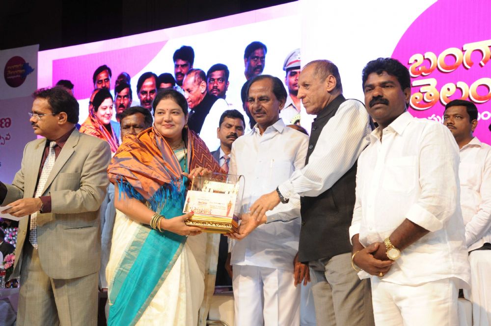 Governor ESL. Narasimhan and Chief Minister K. Chandrashekhar Rao Presenting Telangana State level Awards-2016 to the Awardees and Appointment Orders at the Special meeting of Telangana State Formation Day Celebrations at HICC, Madhapur on 2nd June 2016.
