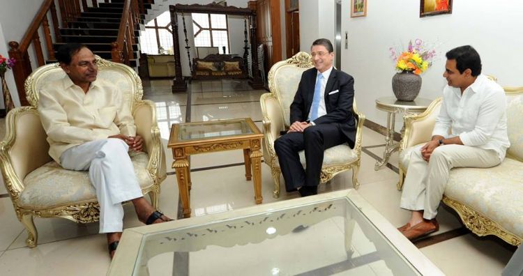 Dr Martin Ney, German Ambassador called on Telangana Chief Minister K Chandrashekar Rao on Tuesday afternoon at camp office and complemented the Government of Telangana for conceiving and implementing a variety of people centric programs. Minister for IT- KT Rama Rao was also present.