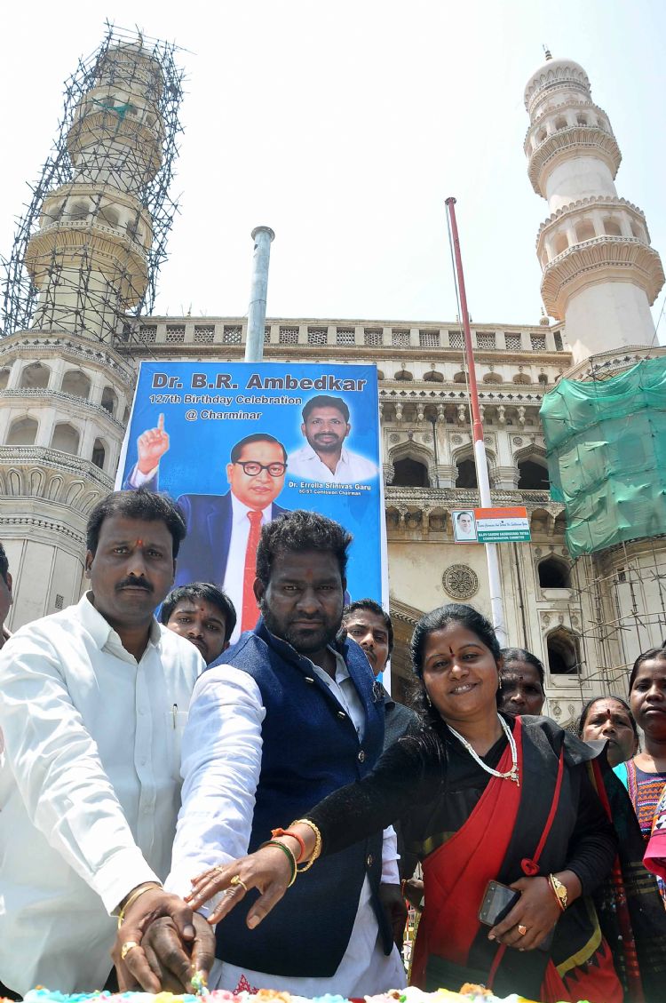 Activists of various organisations cut a cake to celebrate 127th birth anniversary of Dr. B.R. Ambedkar at Charminar on Saturday - INN Photos