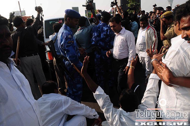 Police arrest Lagadapati Rajagopal, wearing black jacket, a ruling party lawmaker from Vijayawada who was preparing to begin a high-profile hunger strike to protest the splitting of the state, in Hyderabad, India, Monday, Dec. 14, 2009. Most trains and buses started running again Monday and businesses and schools reopened in Andhra Pradesh state following three days of violent protests against the government's plan to split up the southern Indian state. The lawmaker was freed hours later.
