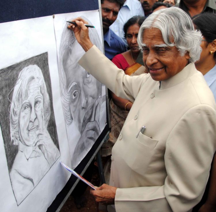 Former President of India Dr.A.P.J Abul Kalam with his Portrait Sketch by the students of P Obul Reddy School holding Indian tricolor at Jubilee Hills in Hyderabad on Friday. INN photos