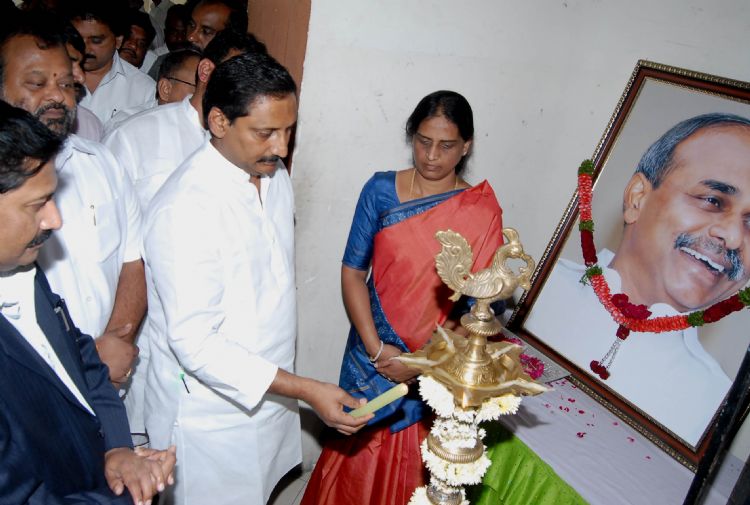 Assembly Speaker N Kiran Kumar Reddy lights a lamp as part of the tributes to former chief minister late YS Rajasekhara Reddy on the occasion of his first death anniversary at Ravindra Bharati in Hyderabad on Thursday. Home Minister P Sabitha Indra Reddy, Minister for BC Welfare Mukesh Goud and Health Minister D Nagender, along with I and PR Commissioner C Parthasarathi are also seen. INN Photos