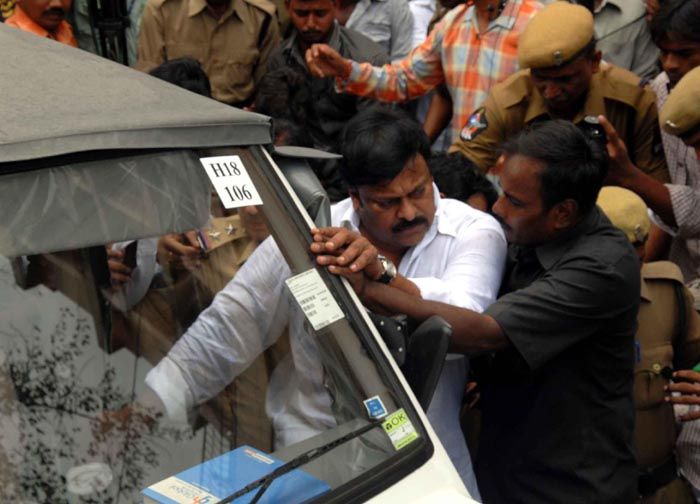 Police arrest Praja Rajyam Party president K Chiranjeevi and his party leaders following a protest at the APIIC office demanding CBI probe in to the irregularities in allotment of prime property by the APIIC to individuals and companies in Basheer Bagh in Hyderabad on Monday. INN Photos