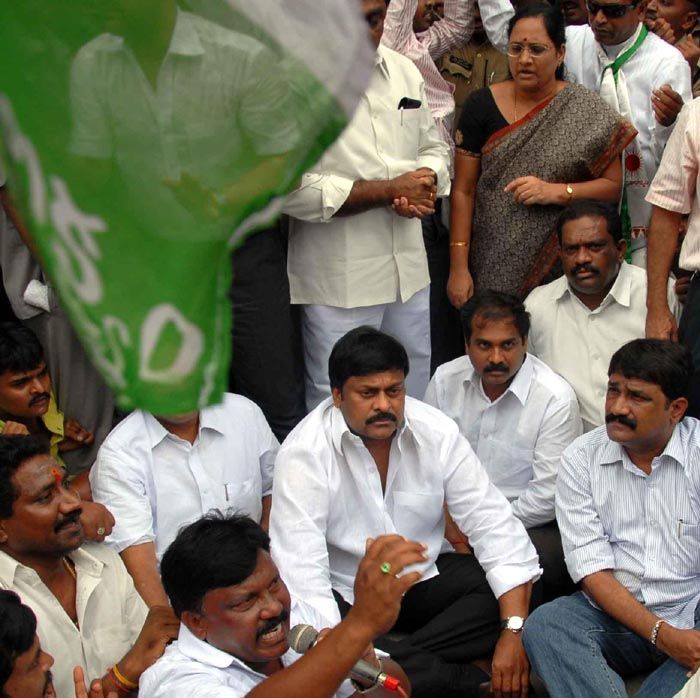 Police arrest Praja Rajyam Party president K Chiranjeevi and his party leaders following a protest at the APIIC office demanding CBI probe in to the irregularities in allotment of prime property by the APIIC to individuals and companies in Basheer Bagh in Hyderabad on Monday. INN Photos