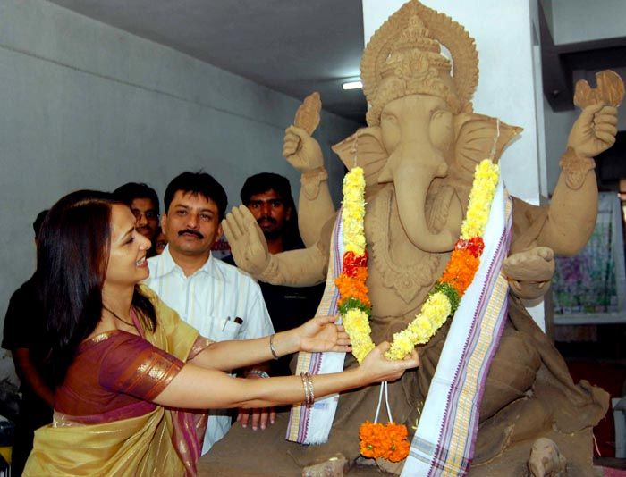 Chairperson of the Blue Cross Foundation and film actress Amla with the eco-friendly Ganesh in Hyderabad on Thursday. INN Photos