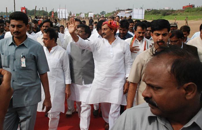 Chief Minister Kiran Kumar Reddy greeting a large number of Congress activities gathered on the banks of Pranahita river near Arjunagutta to receive him on the eve of launching of Pranahita Pushkaralu on Monday.