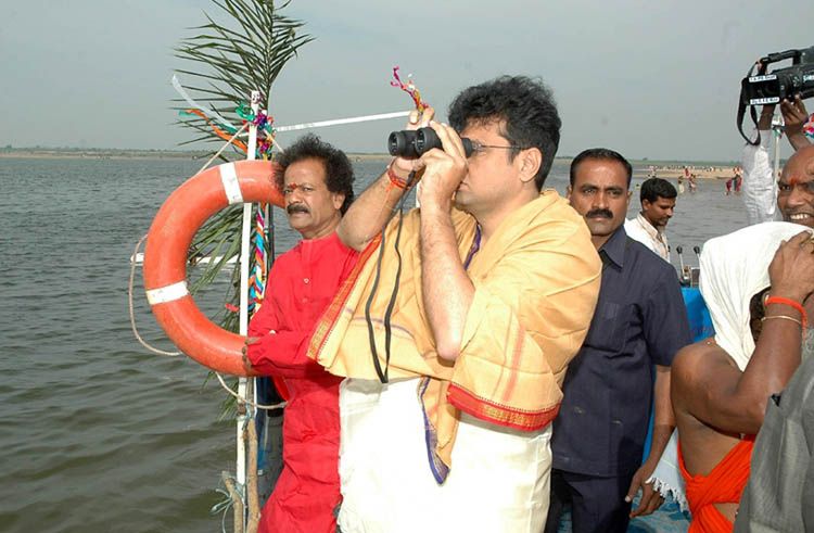 Civil Supplies Minister D. Sridhar Babu formally inagurated the Pranahita Pushkaralu by taking a holy bath in the river and performing a special ritual at Kaleshwaram near Karimangar on Monday. With a binoculars the minister is taking a close look at the expanse of river.