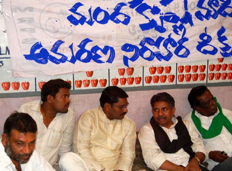 Supporters flank Madiga Reservation Porata Samithi President Manda Krishna Madiga at Hyderabad on Sunday. INN Photos