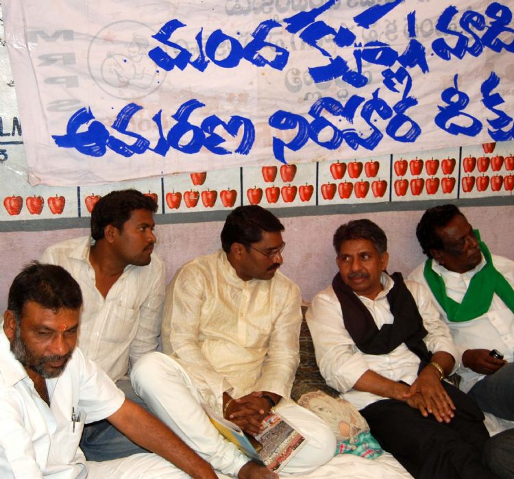 Supporters flank Madiga Reservation Porata Samithi president Manda Krishna Madiga as he launches his indefinite hunger strike to build pressure on the government to categorise the Schedule Castes at Jai Bharati Harijan Seva Sangam, Parsiguda in Hyderabad on Sunday. INN Photos