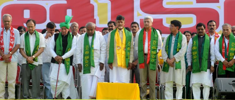 National leaders like Prakash Karat, Deve Gowda, Ajit Singh, Chautala joined TDP president N.Chandra Babu Naidu in flaying the anti farmer policies of both sate and central governments at ‘Rytu Kosam' public meeting organised by TDP at Brahmananda Reddy stadium in Guntur on December 30.