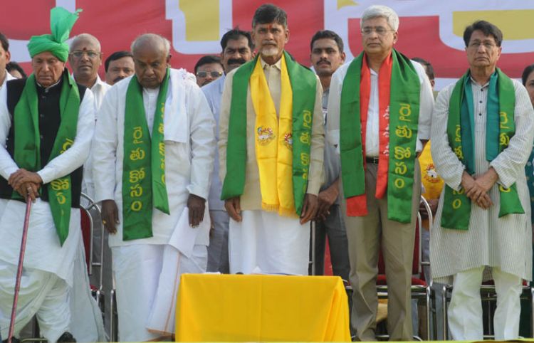 National leaders like Prakash Karat, Deve Gowda, Ajit Singh, Chautala joined TDP president N.Chandra Babu Naidu in flaying the anti farmer policies of both sate and central governments at ‘Rytu Kosam' public meeting organised by TDP at Brahmananda Reddy stadium in Guntur on December 30.