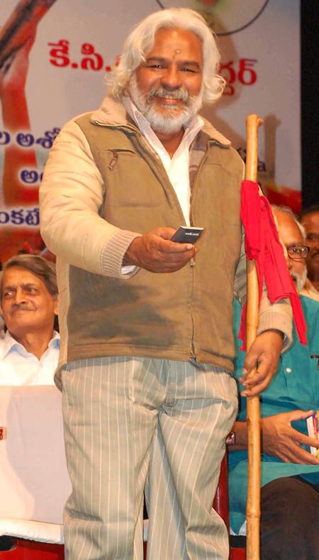 Telangana Rashtra Samithi president K Chandrasekhar Rao releases the Audio CDs of the film 'Jai Bolo Telangana' at Ravindra Bharati in Hyderabad on Saturday. Balladeer Gaddar and the film's lead actor Jagapathi Babu, along with director Shankar are also seen. INN Photos